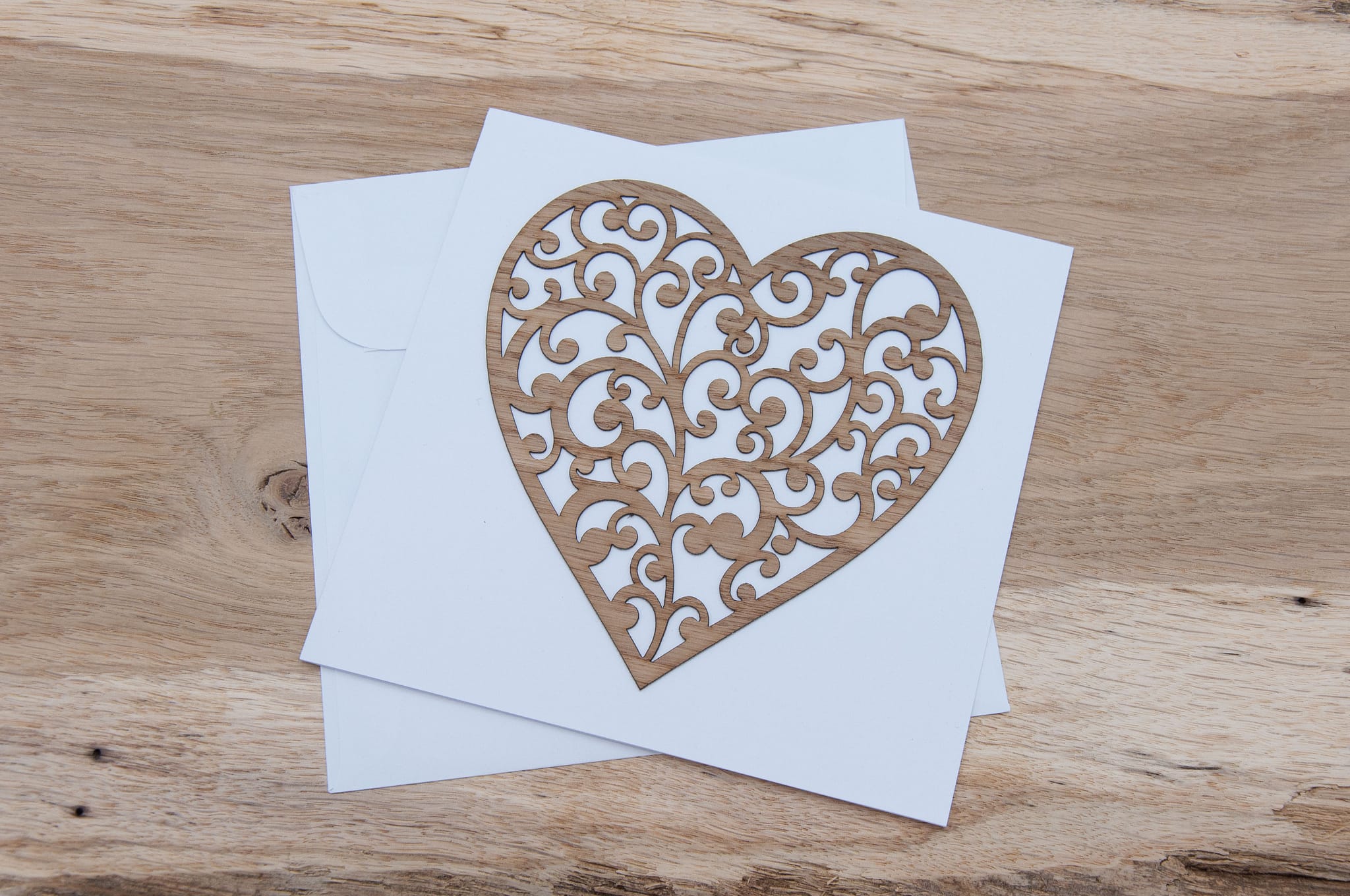 Una graziosa cartolina con un ritaglio in rovere da 1 mm, doppio formato 160x160 mm, con busta abbinata