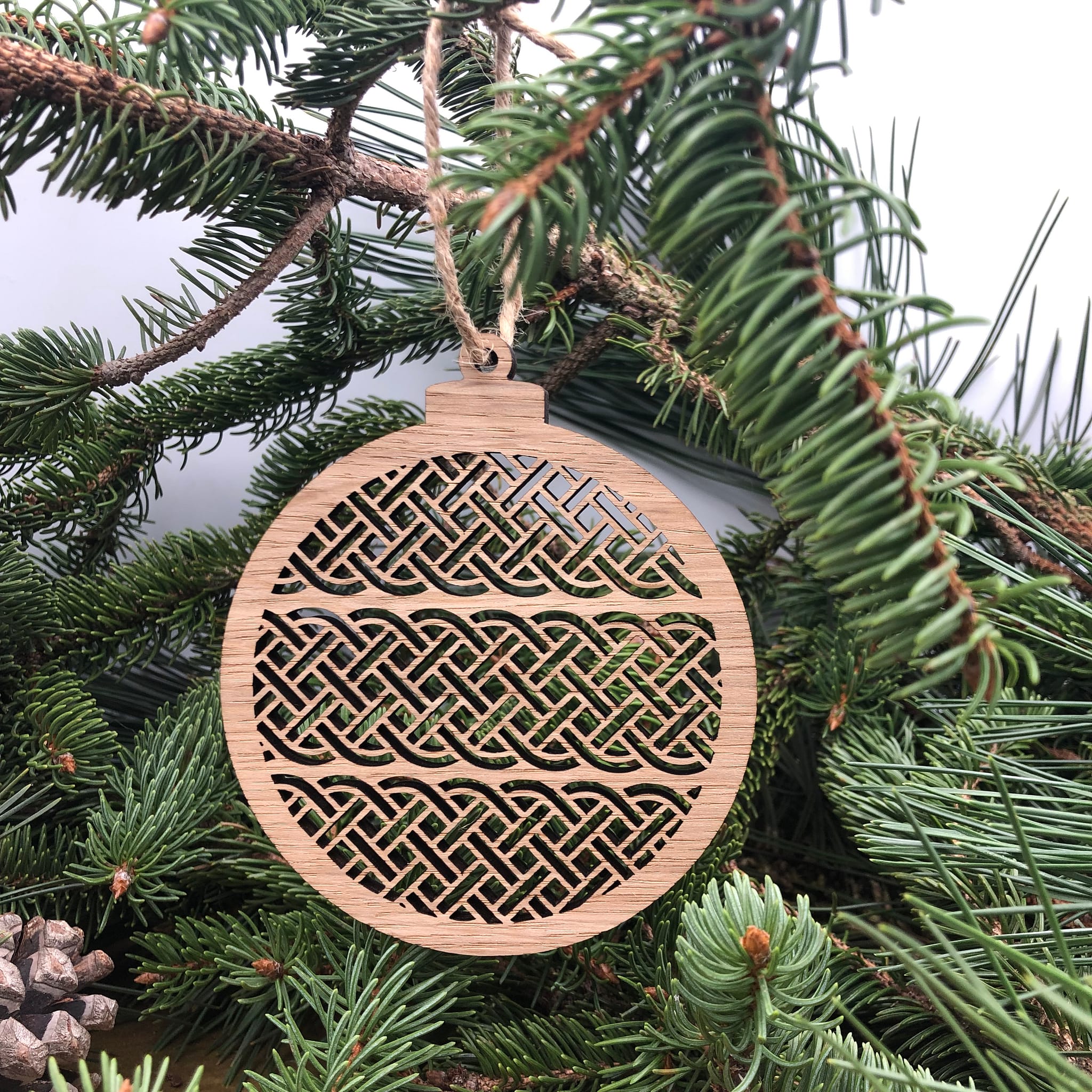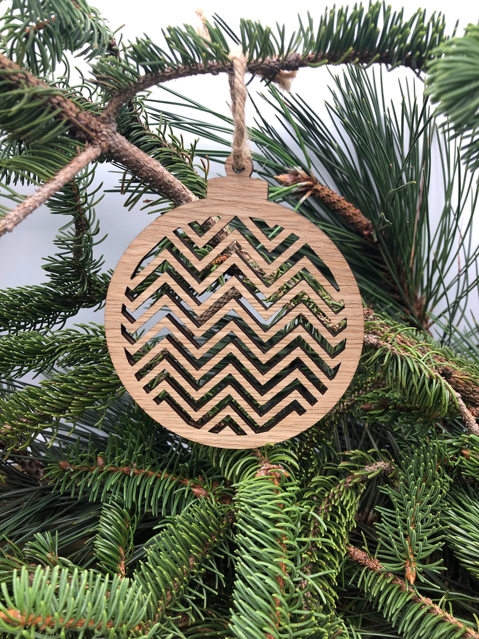 Tre splendide palline di Natale, finemente tagliate su un'impiallacciatura di rovere da 6 mm. Valorizzeranno il tuo albero con un tocco naturale ed elegante.