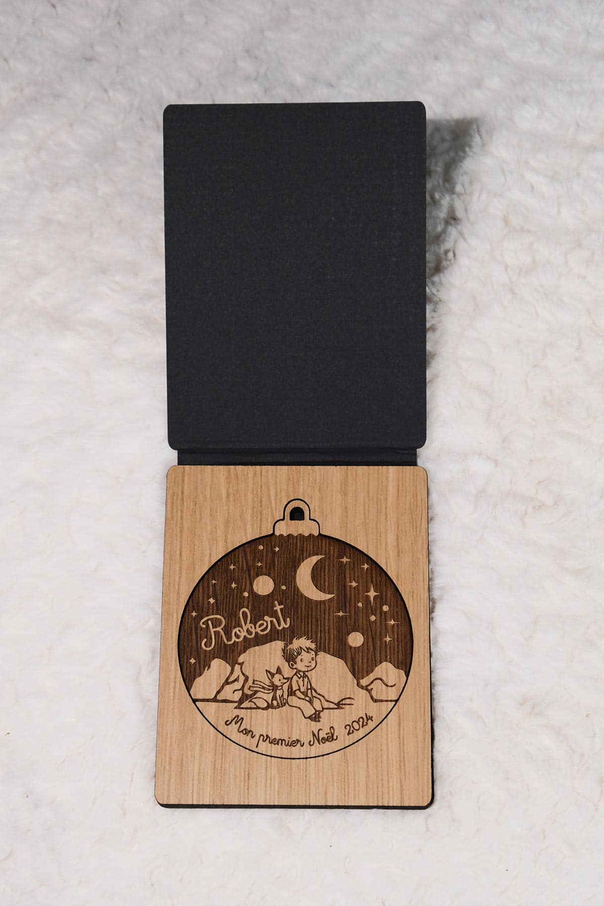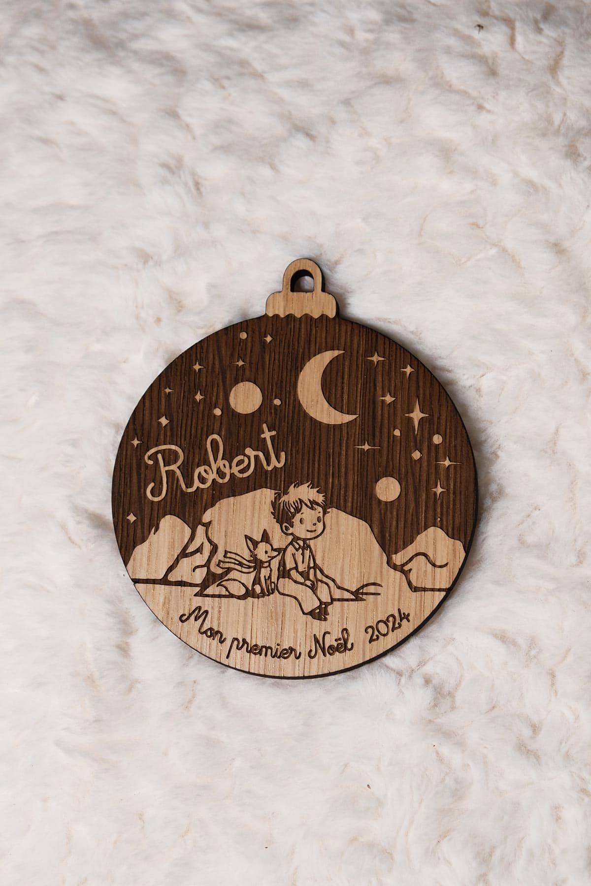 Célébrez l’arrivée de votre bébé avec notre Boule Petit Prince Mon premier Noël. Personnalisée avec son prénom et son année de naissance, cette boule est fabriquée avec du placage chêne régional 6 mm d’épaisseur, découpée et gravée avec soin.