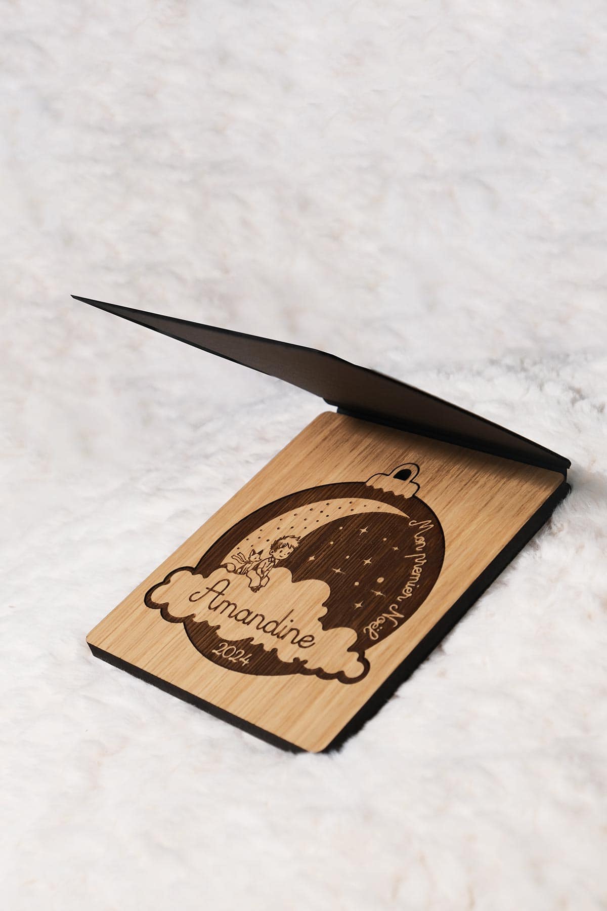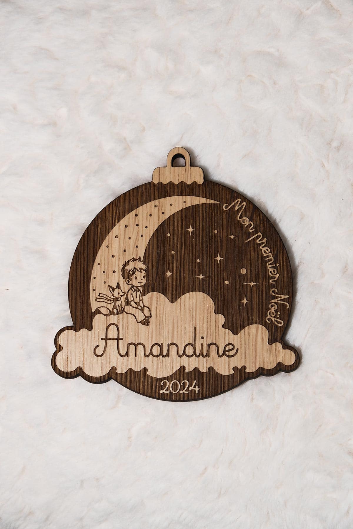 Célébrez l’arrivée de votre bébé avec notre boule Sur la Lune “Mon premier Noël” en bois. Personnalisée avec son prénom et son année de naissance, cette boule est fabriquée avec du chêne régional 6 mm d’épaisseur, découpée et gravée avec soin.
