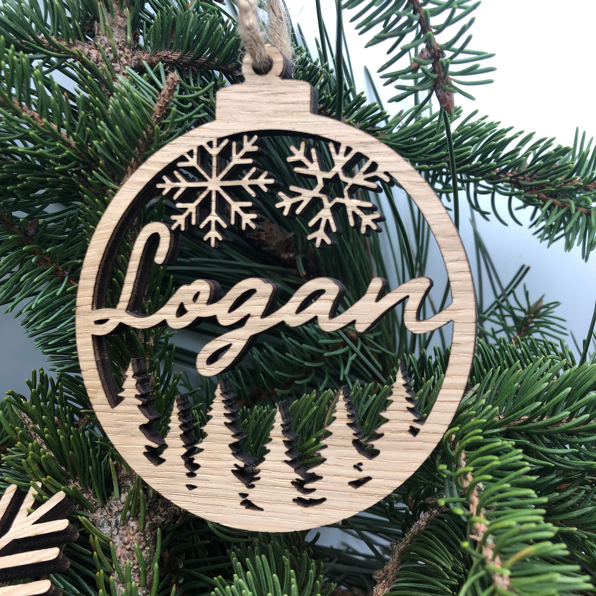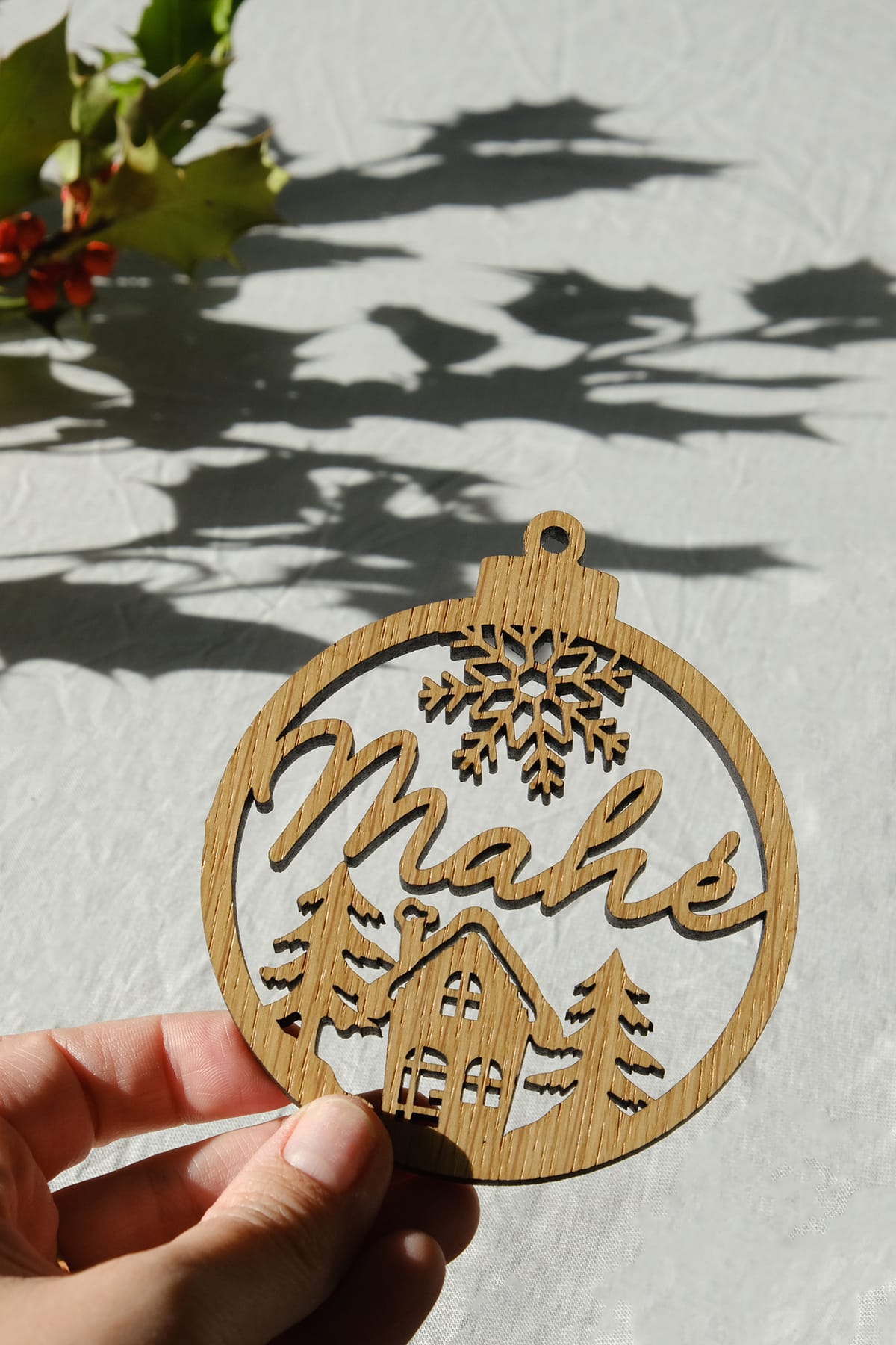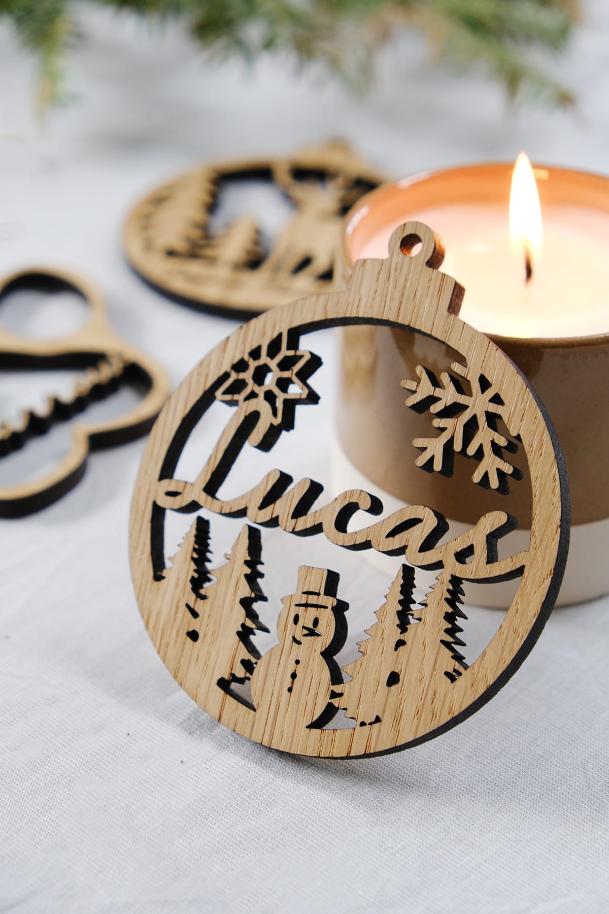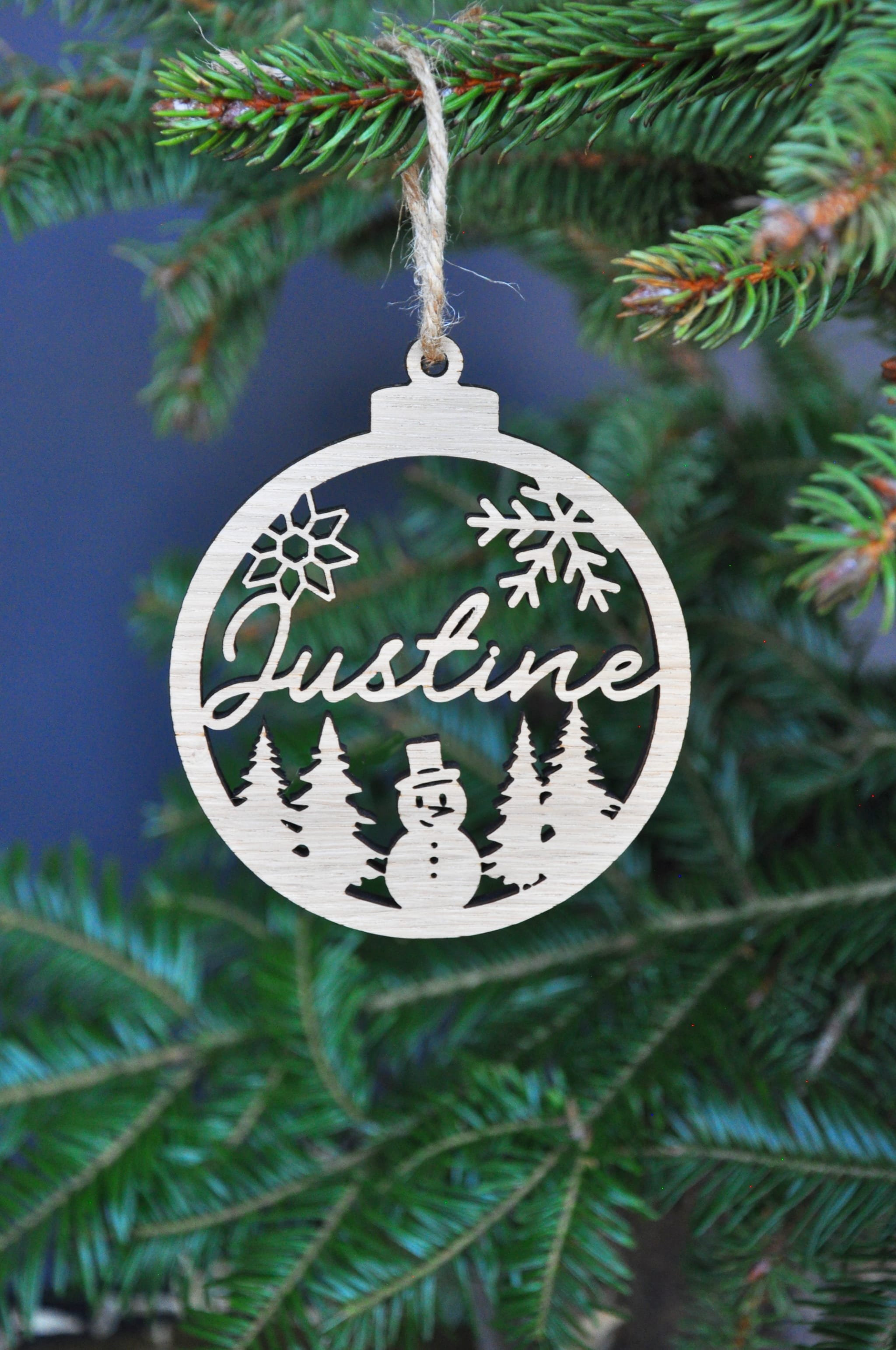 Boules de Noël personnalisées en bois pour un magnifique sapin qui fera le bonheur de toute la famille avec le prénom et 6 décors à choisir pour chaque boule.