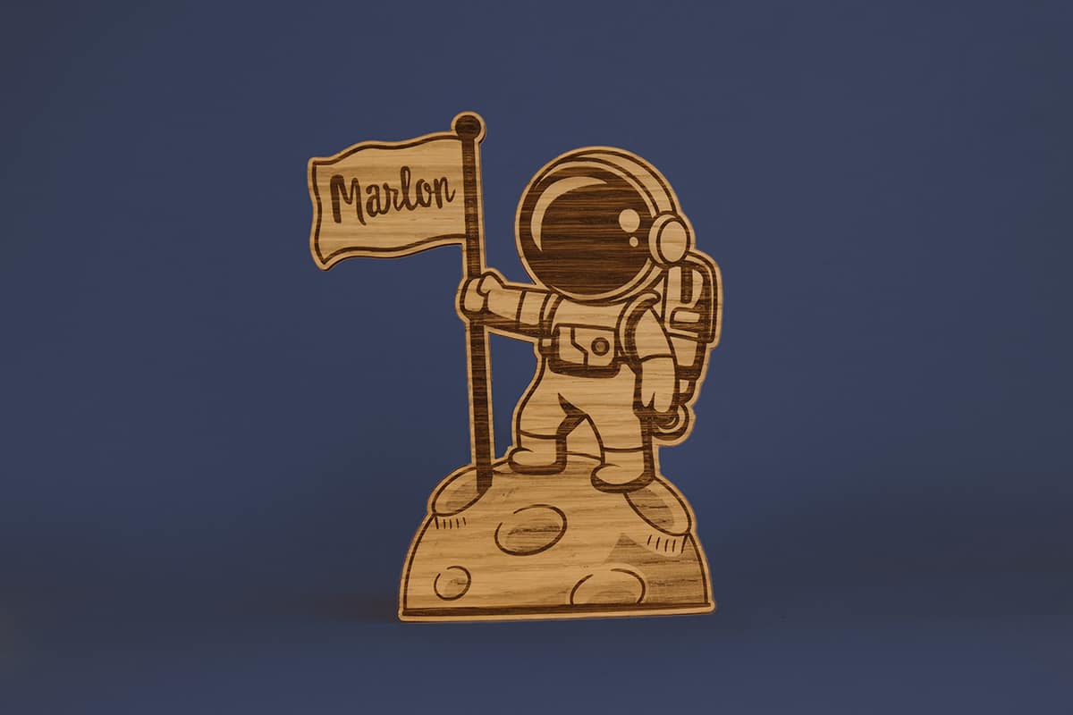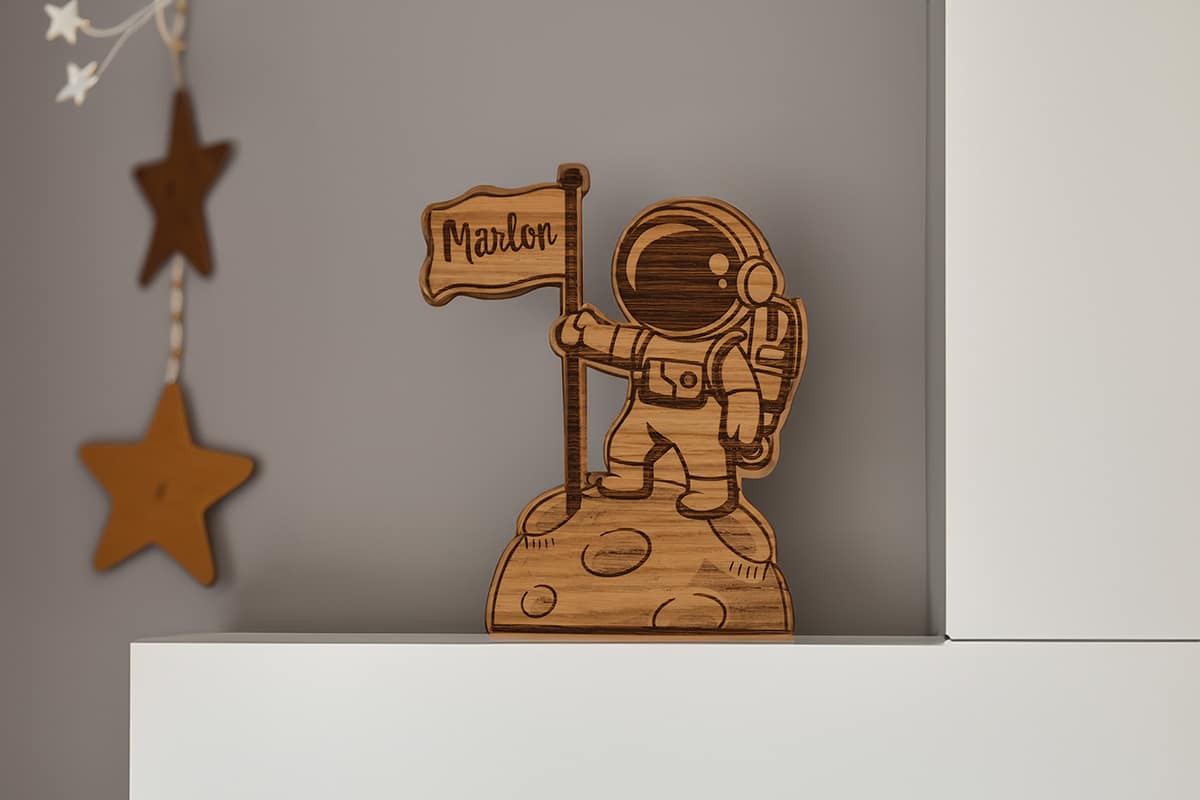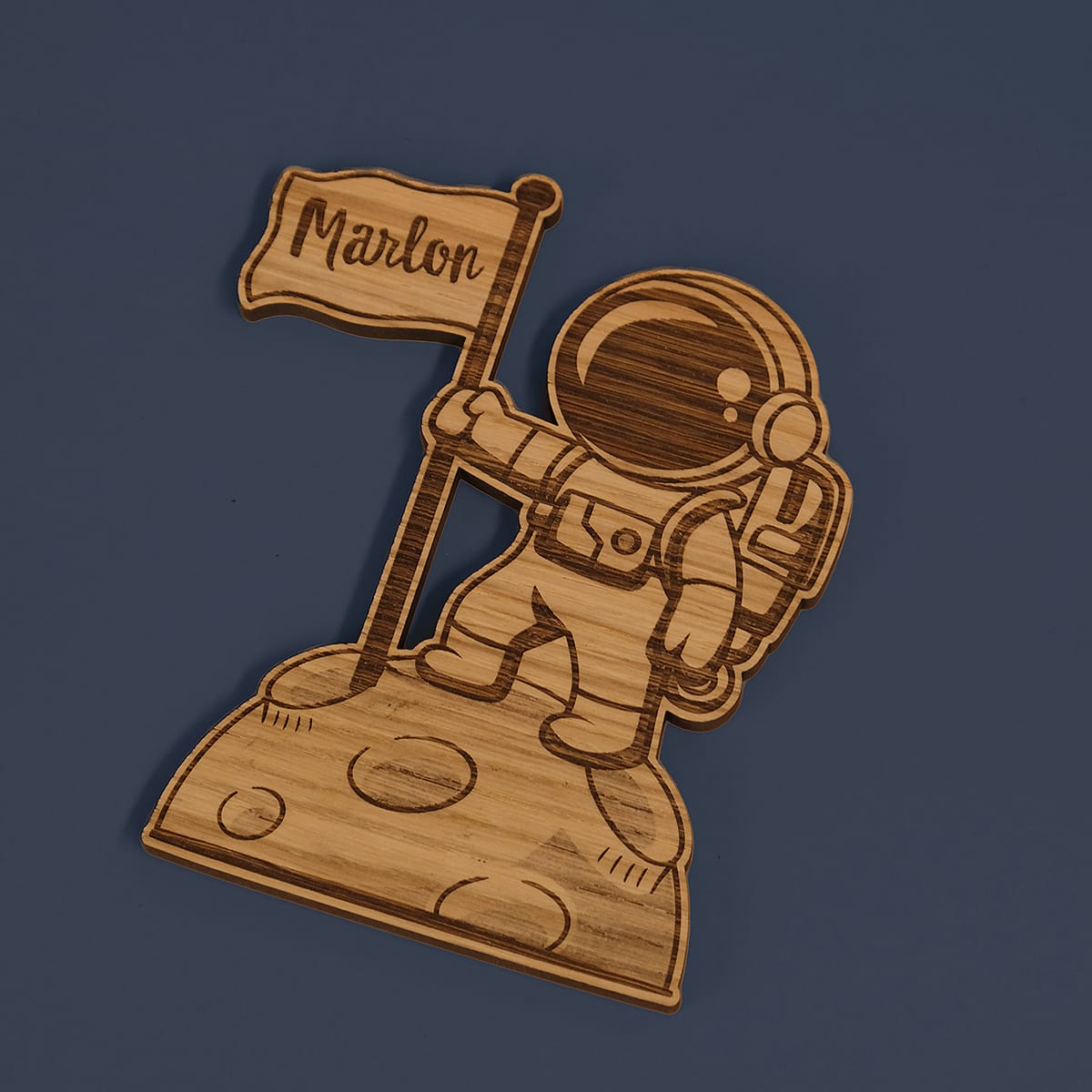 Imaginez votre enfant s’émerveiller devant cette décoration personnalisée, suspendue fièrement sur le mur de sa chambre. Le cosmonaute en bois tient fièrement un drapeau, symbolisant l’exploration de l’espace et l’esprit d’aventure.