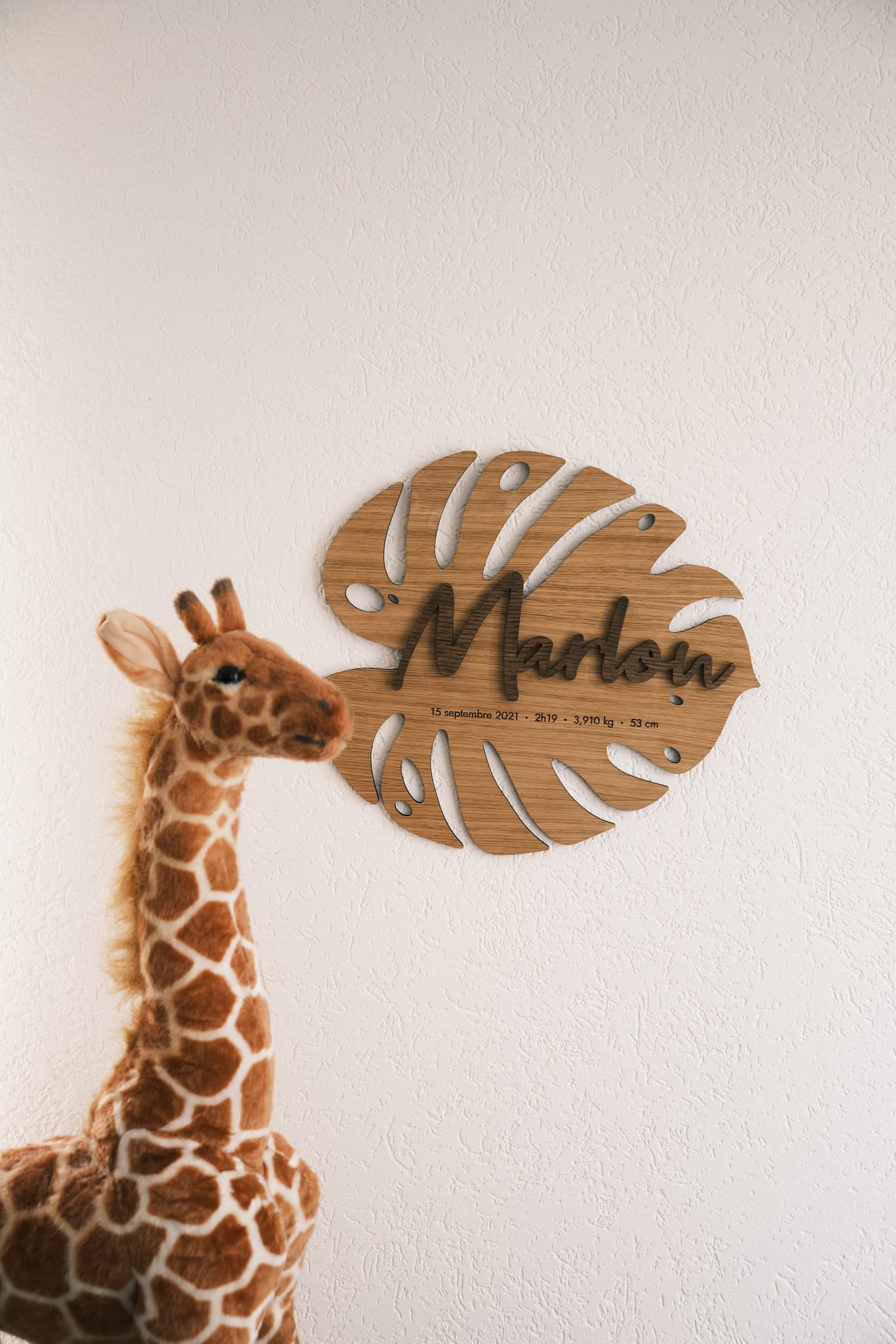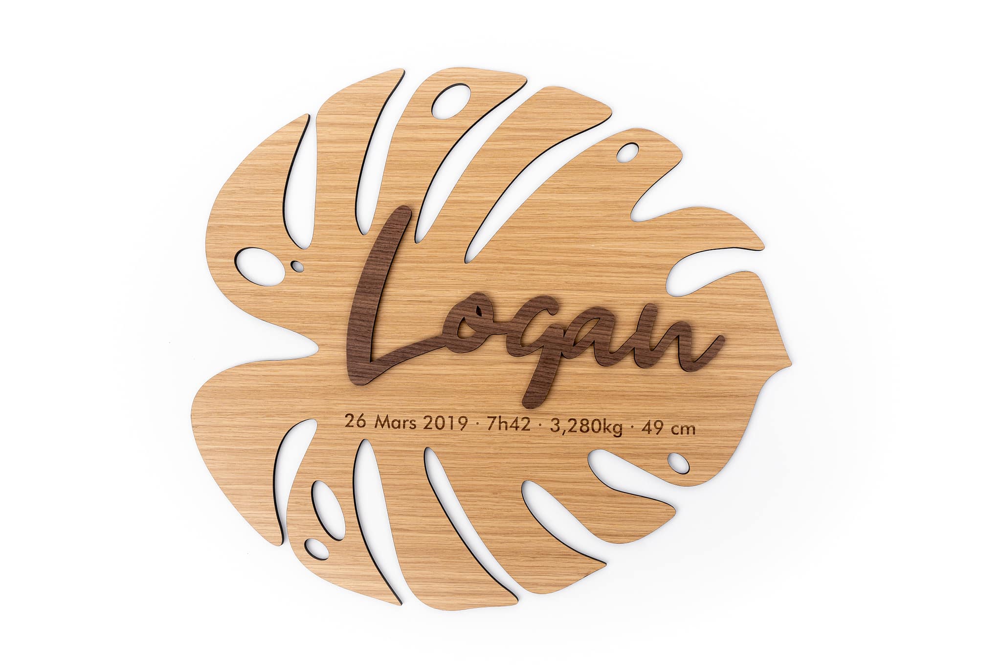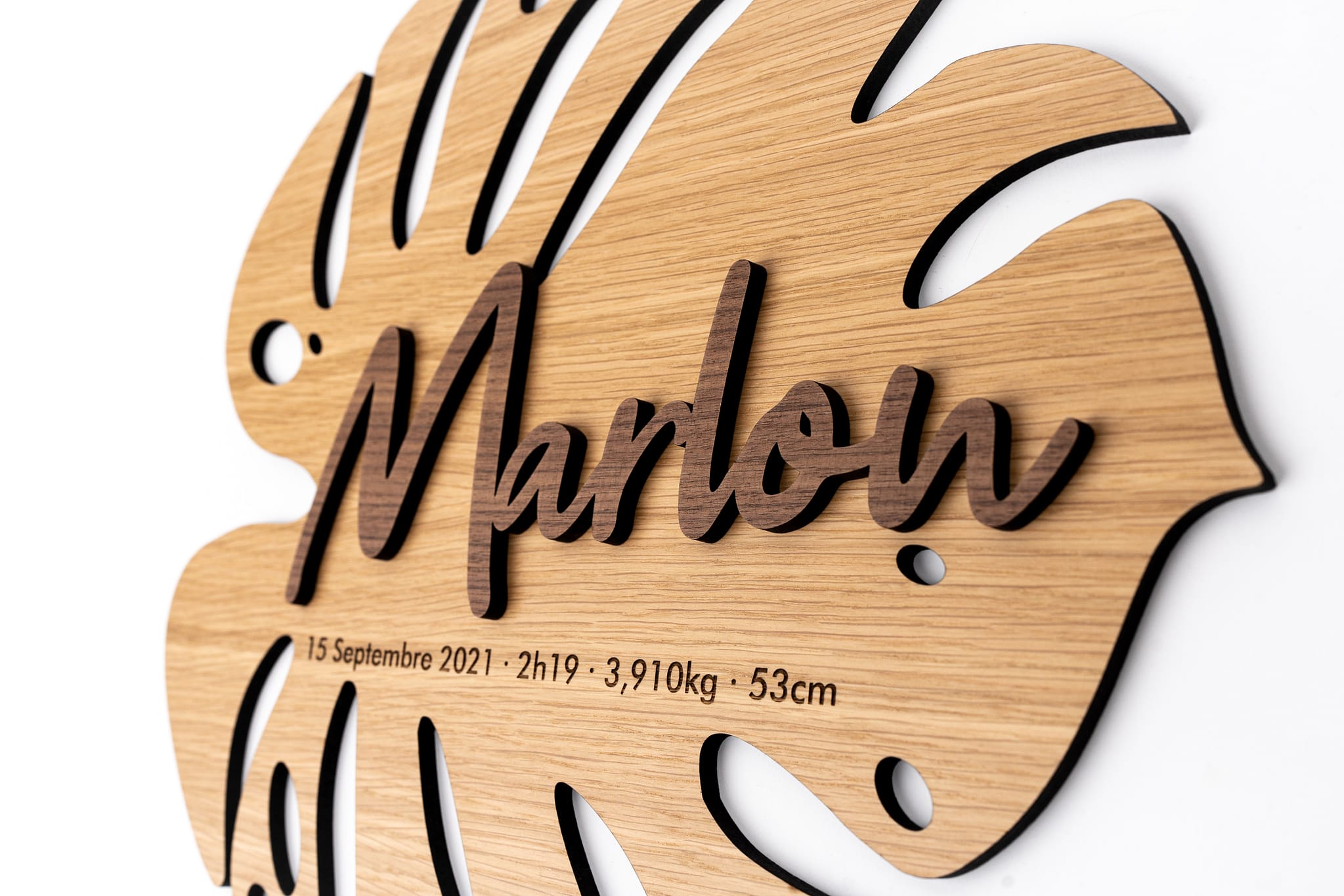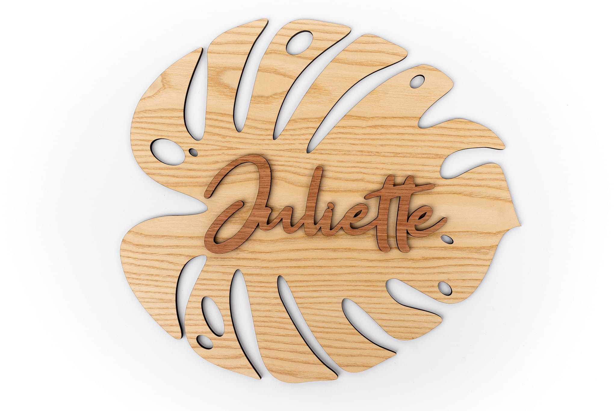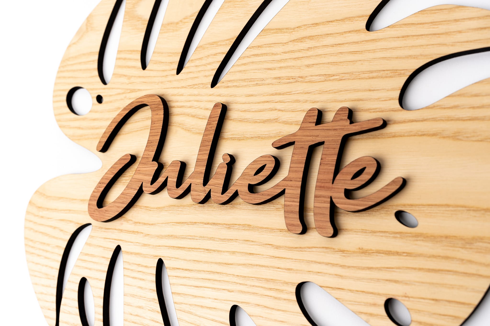 La découpe du prénom se fait en différentes déclinaisons selon le contraste recherché, tout naturellement en combinant nos essences de bois.