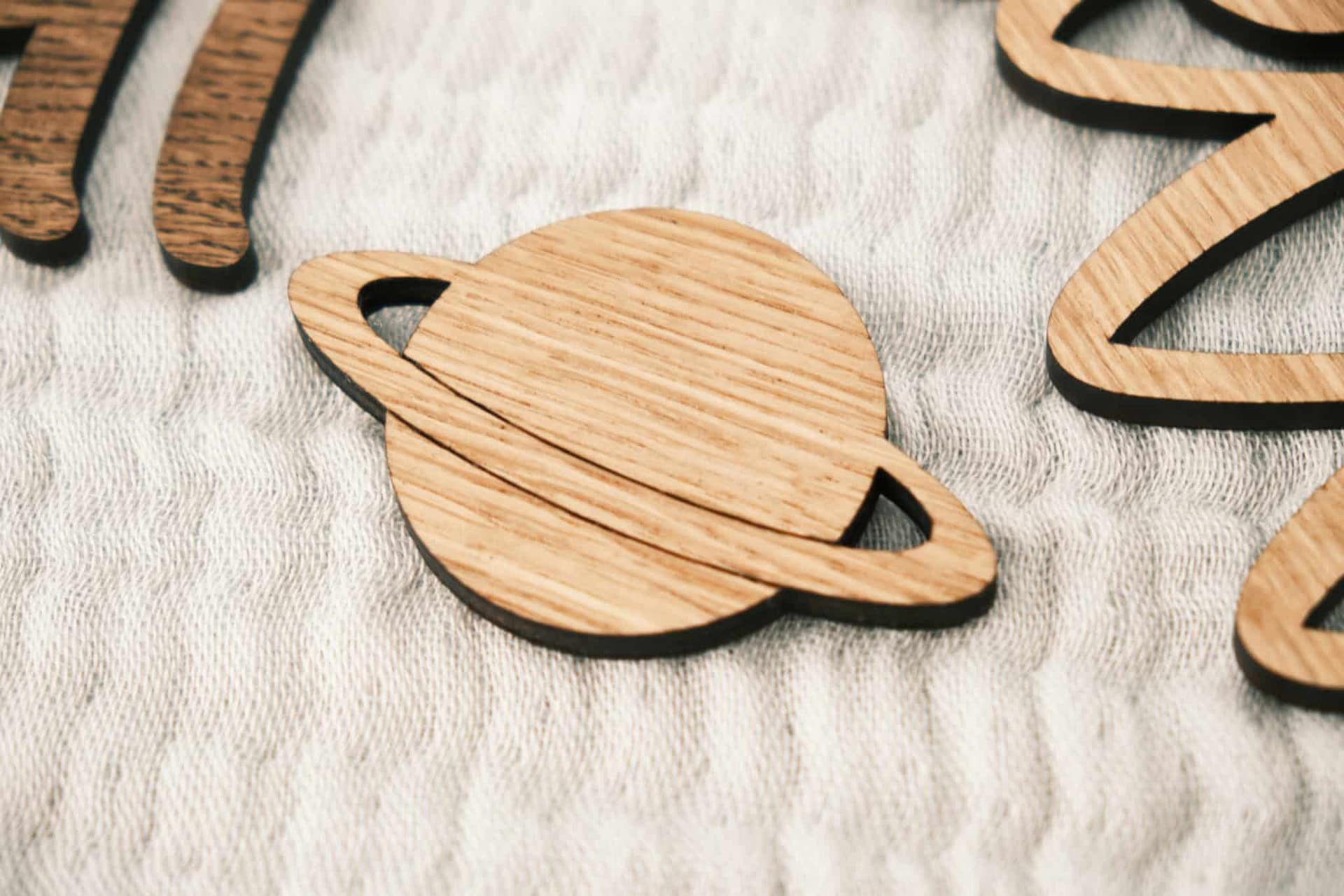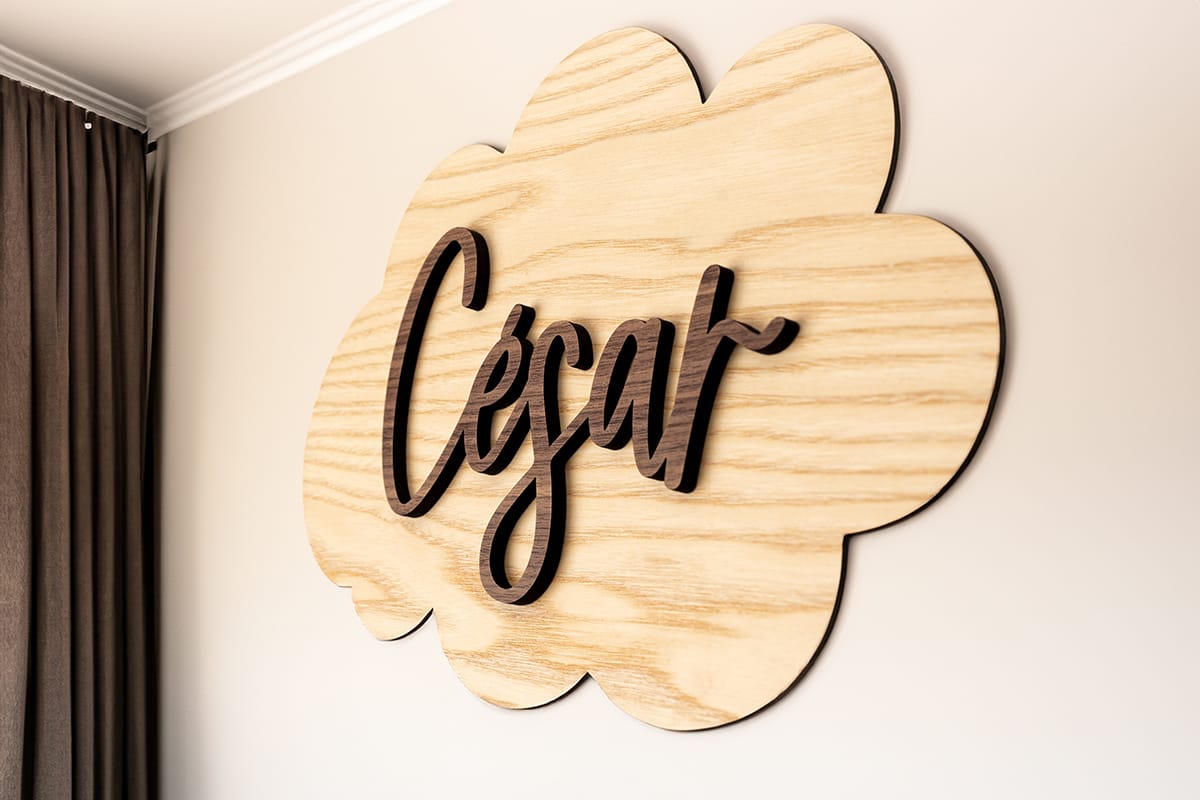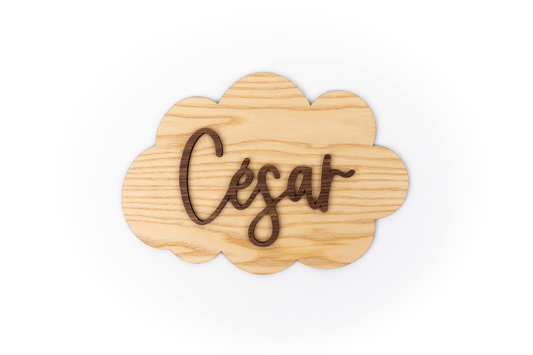 Le prénom sera découpé avec les 2 polices à choix dans 3 nuances d’essences de bois naturelle pour jouer avec le contrastes recherché :