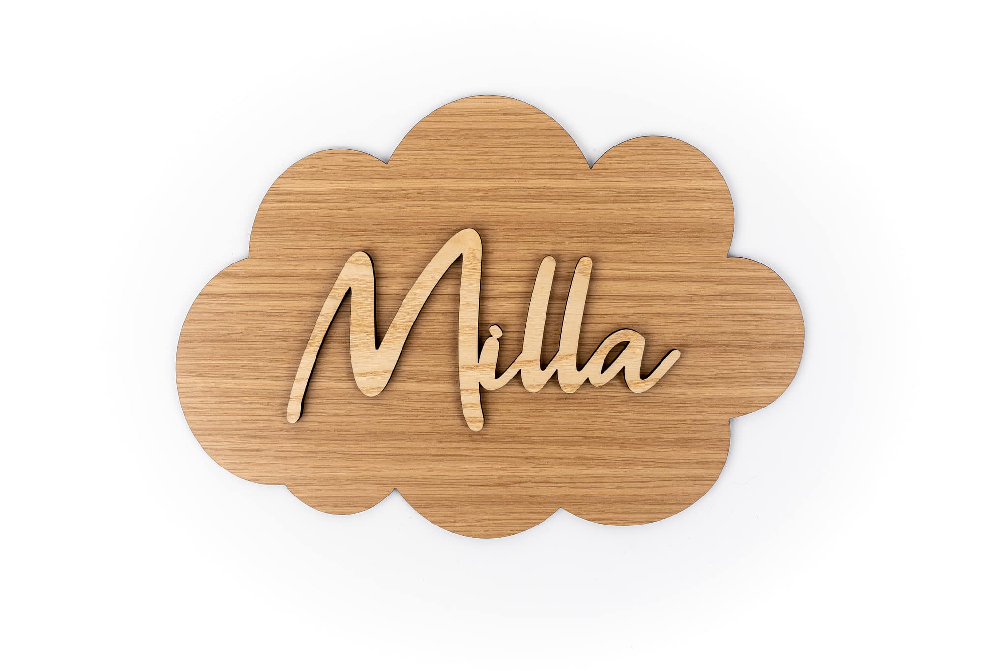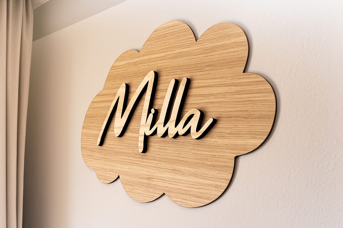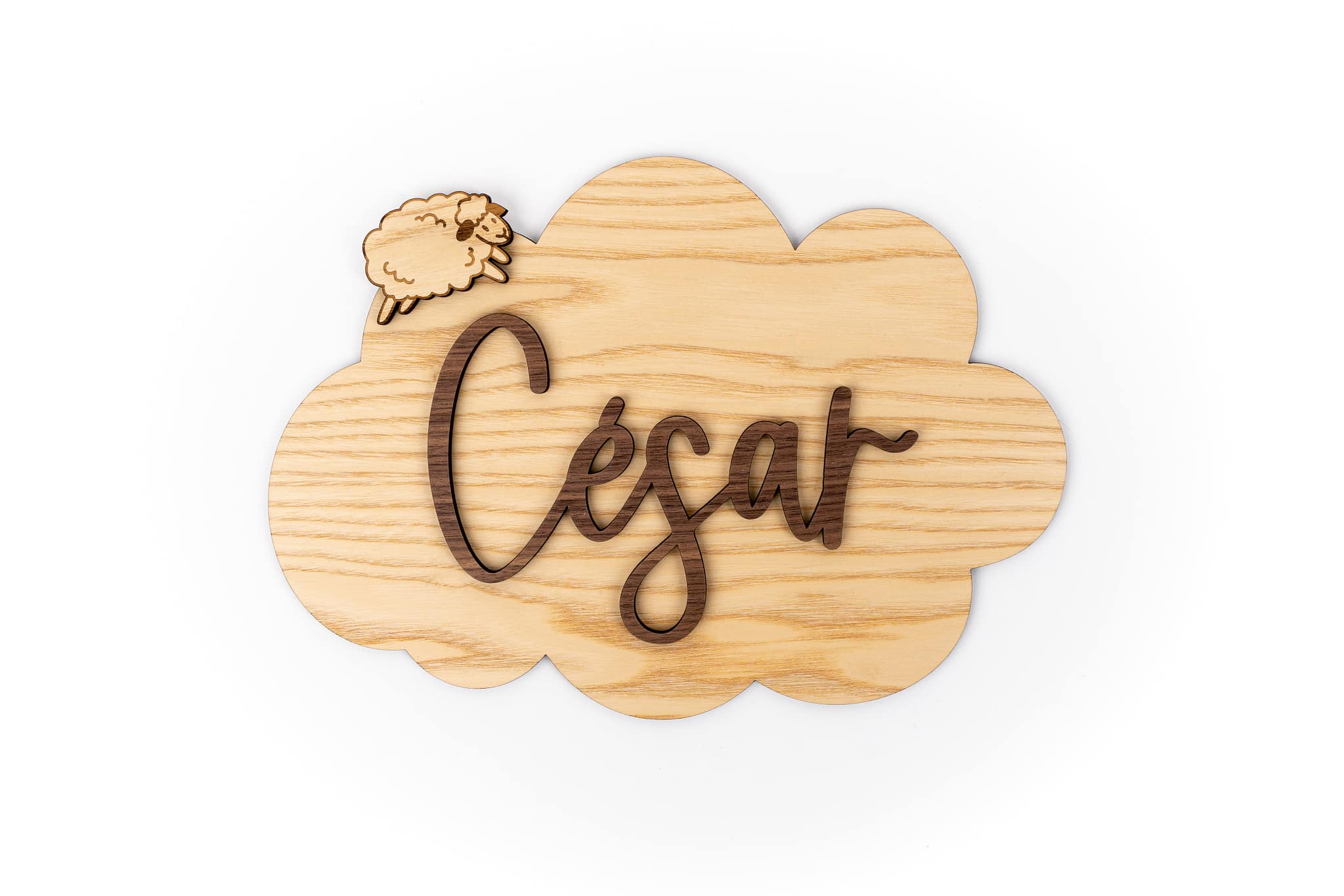 Le prénom sera découpé avec les 2 polices à choix dans 3 nuances d’essences de bois naturelle pour jouer avec le contrastes recherché :