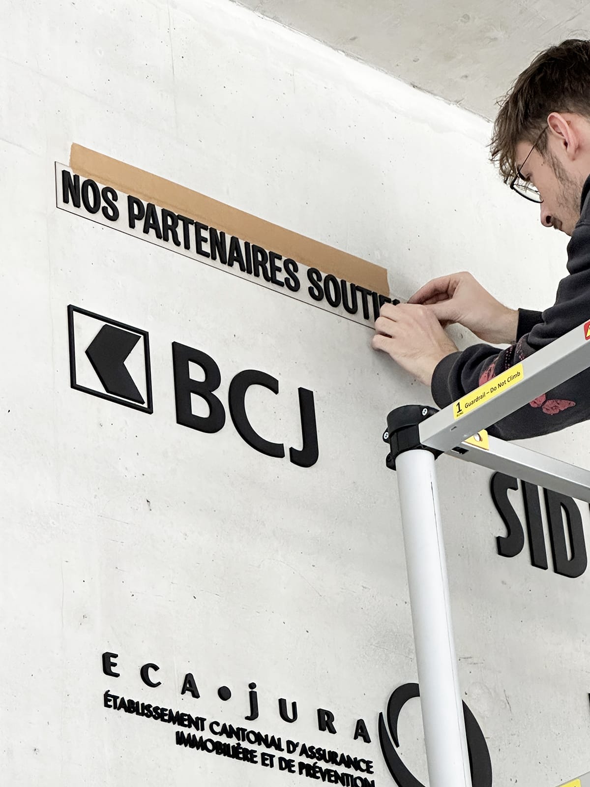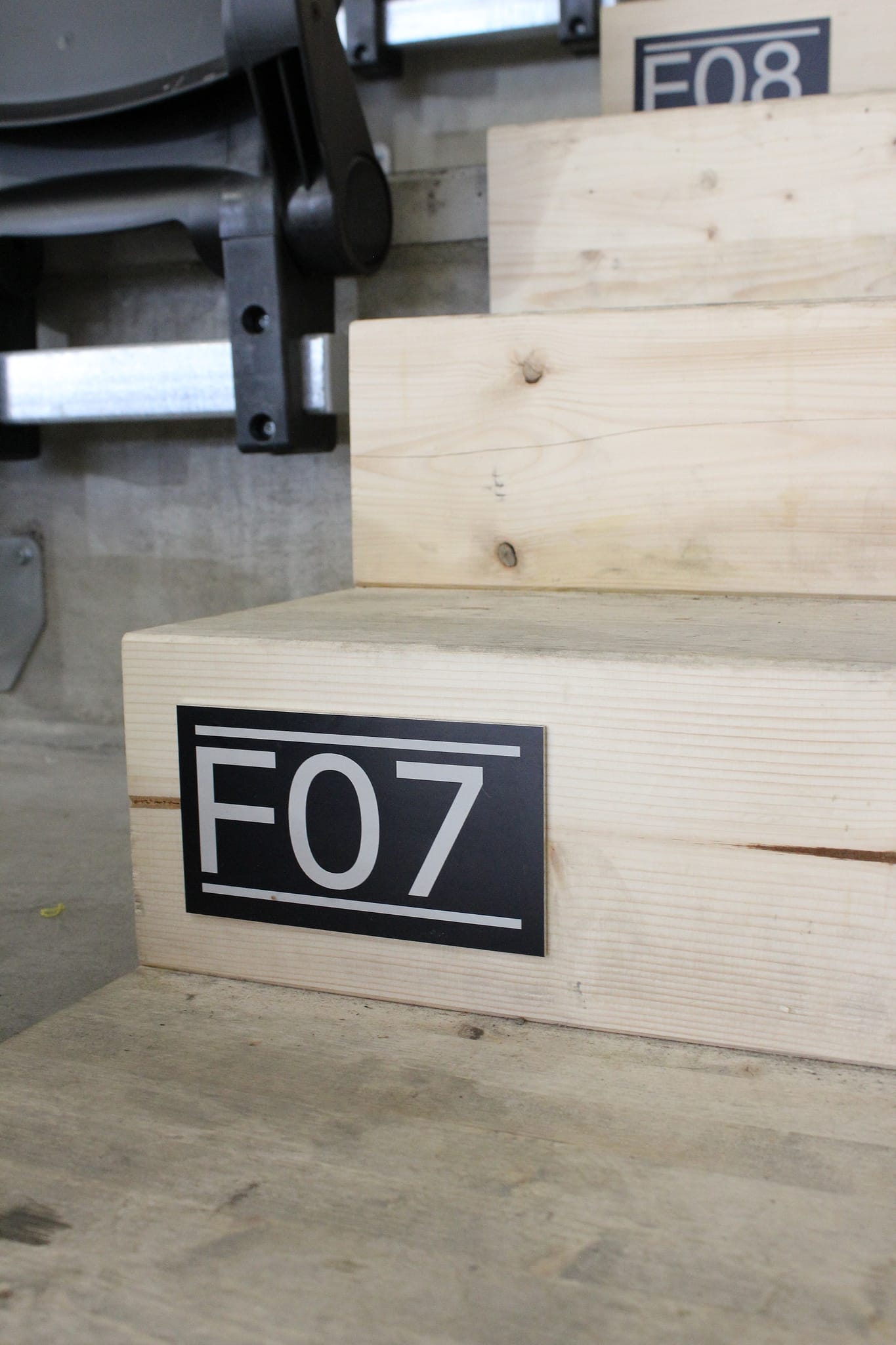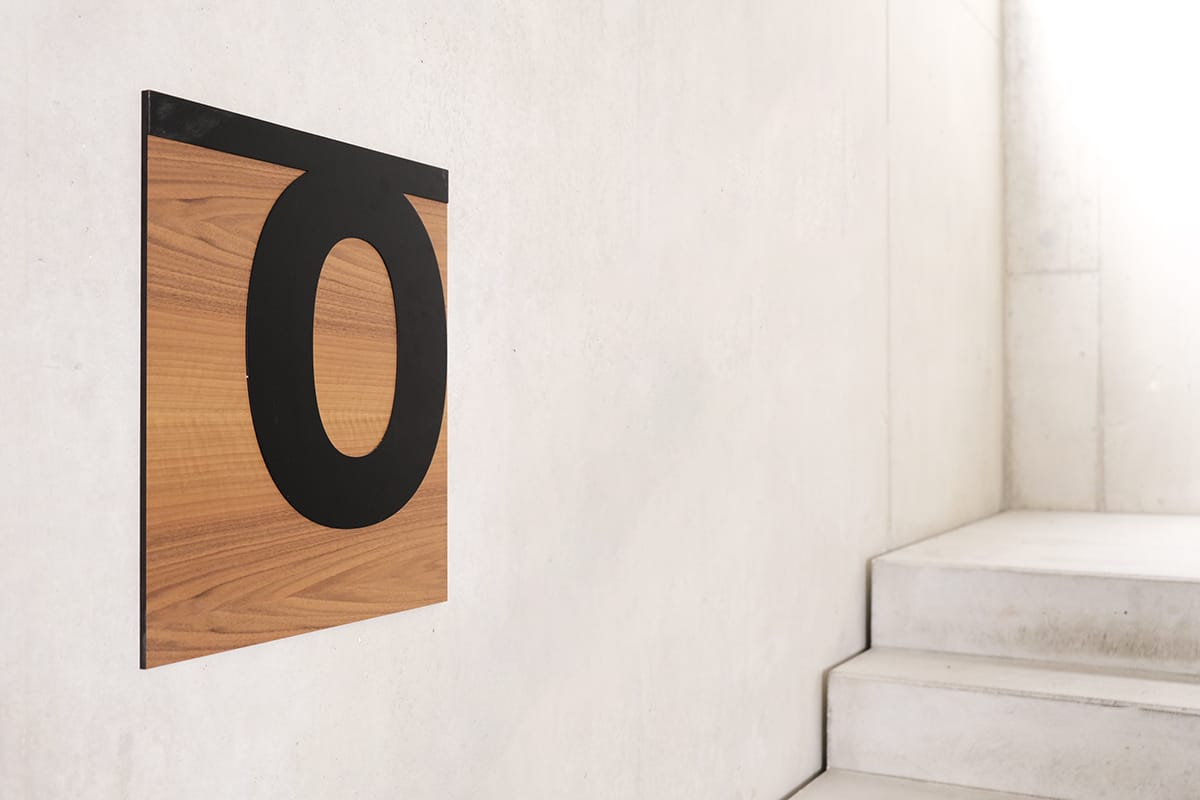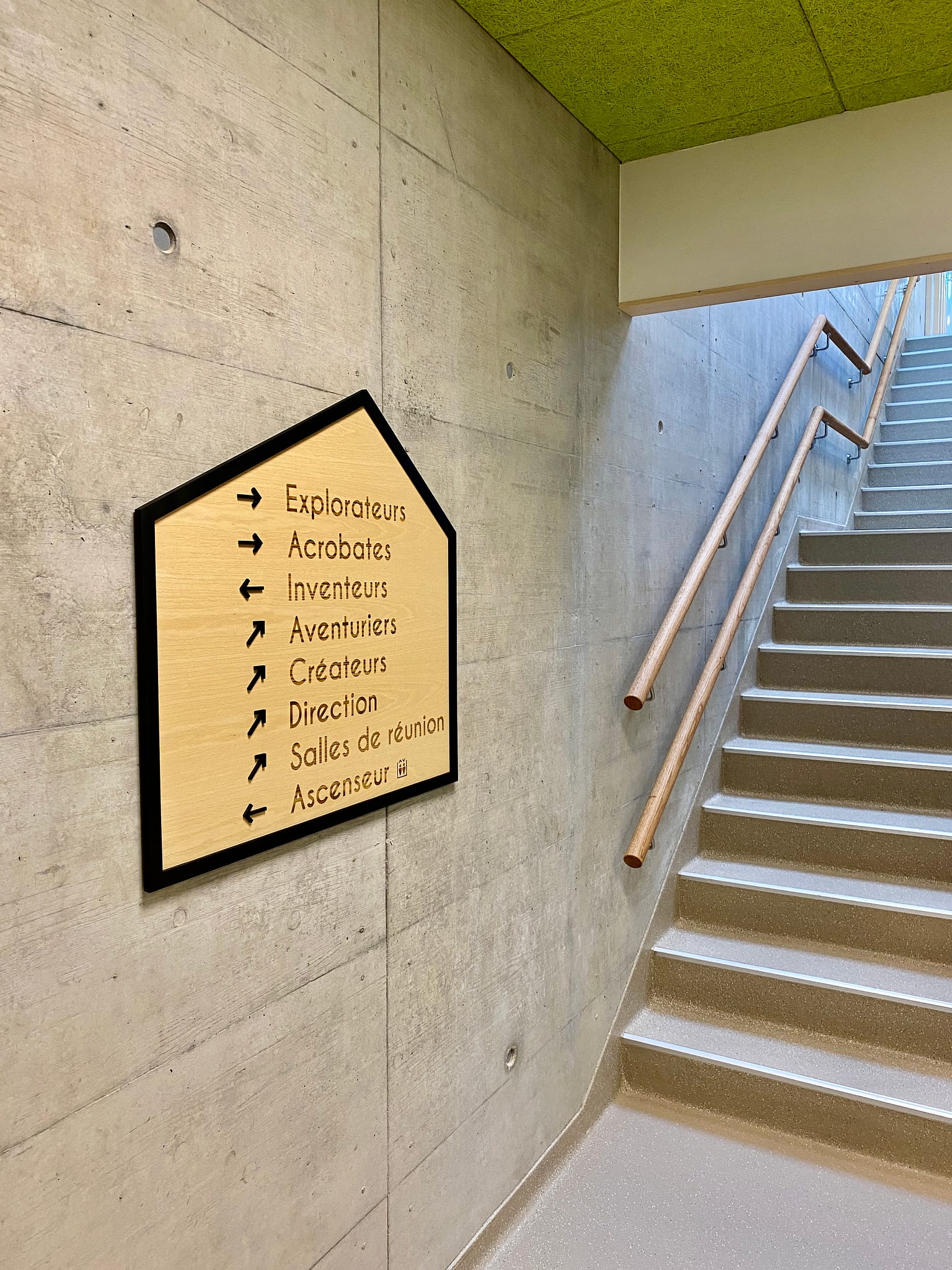 Nous avons découpé toute la signalétique des portes de la nouvelle Arena sur du frêne, ainsi que le marquage sur aluminium pour les escaliers.